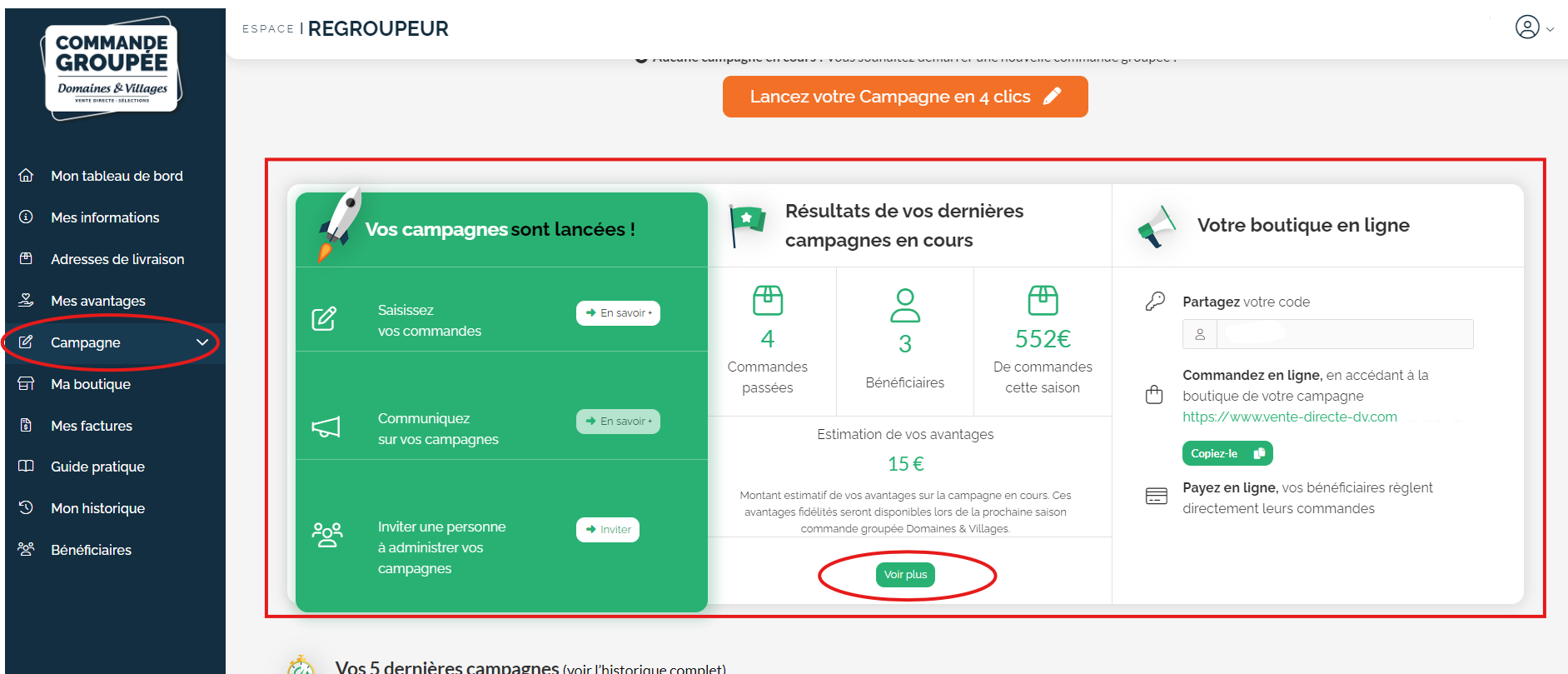 Dans l’écran d’accueil de votre campagne, vous avez tous les outils pour suivre et administrer votre commande groupée.